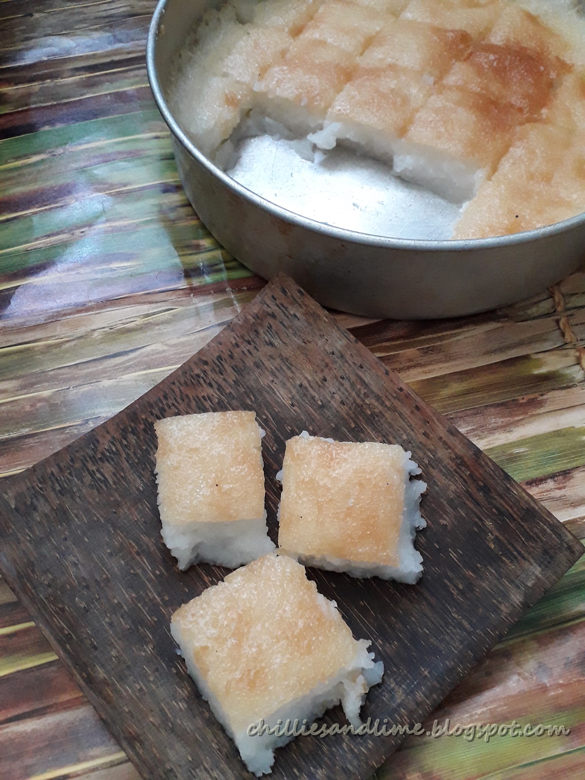 This isn't really a cake, more like a jelly-like slice as the rice becomes starchy as it cooks and thickens and sets once baked, with a crusty golden top. My aunts use plain flour instead of rice flour.